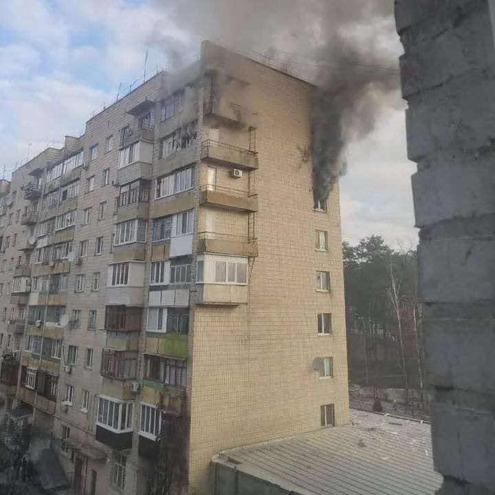 On the second day of the war, as Alina was driving toward the border, an apartment building across from her house in Bucha burned. Her neighbors hid in the ground-floor commercial space all day and night, unable to go outside because of the shooting. Photo courtesy of Alina Lizunova.