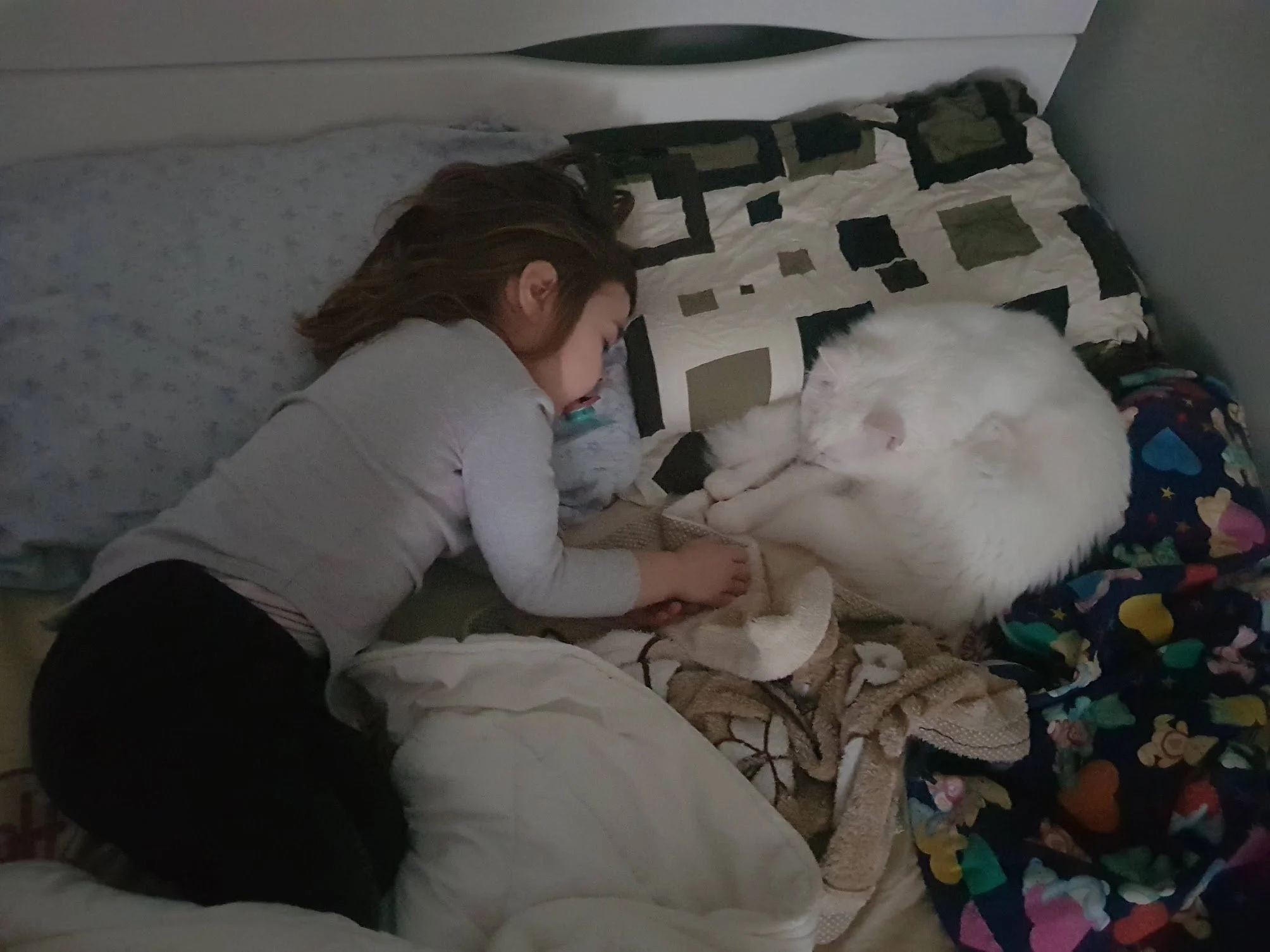 This is how, before the war, Alina’s daughter Kira would sleep with Jike, the cat that her neighbor Vitaliy rescued when he escaped the occupied city. Photo courtesy of Alina Lizunova.