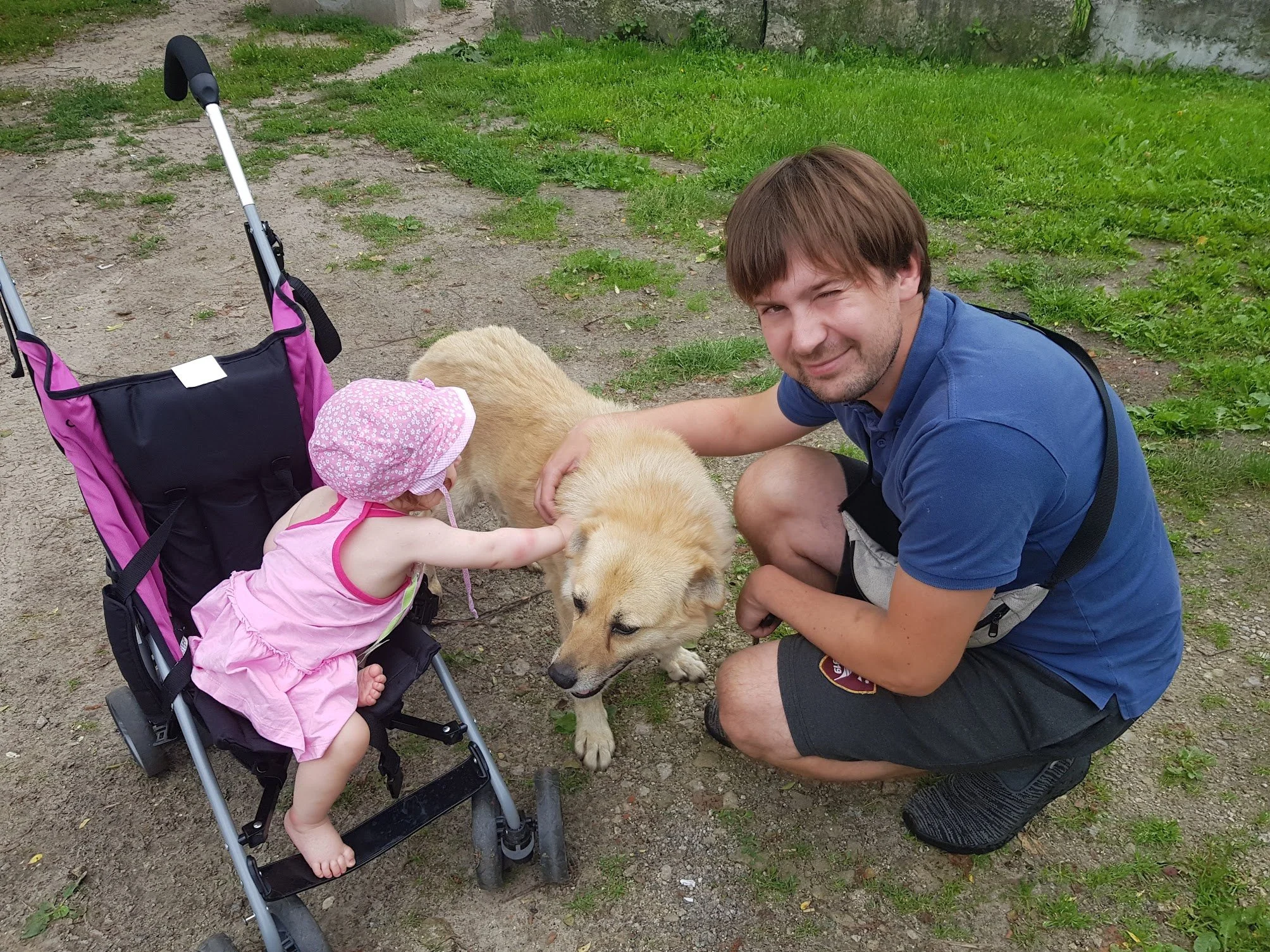 Alina's daughter, Kira, and her father, together with the neighbor's dog Friend, before the war. Photo courtesy of Alina Lizunova.